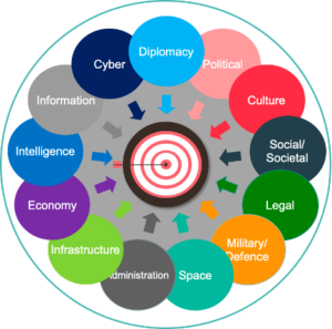 Evropské Centrum Excelence pro boj s hybridními hrozbami v Helsinkách definuje celou paletu strategických domén, ve kterých Rusko a další hráči realizují hybridní útoky proti cílovým aktérům (viz schéma č. 1 níže). Pro potřeby této analýzy jsou tyto nástroje shrnuty pouze v kontextu strategických domén státu PMESII.